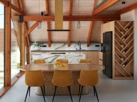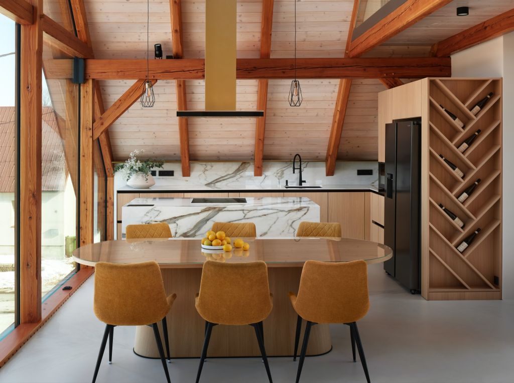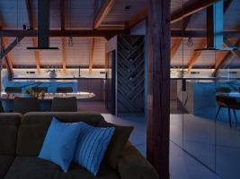 Celý interiér doplňuje chytrá domácnost Loxone, která umožňuje ovládat světla, teplotu či zabezpečení. Součástí návrhu je také originální vinotéka ve tvaru stromu, která propojuje design s osobním příběhem majitele.