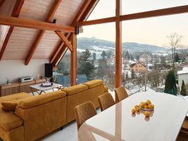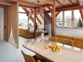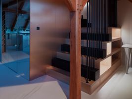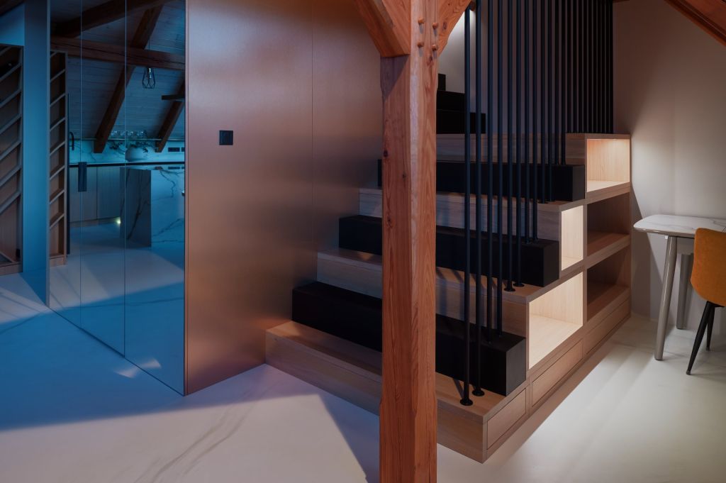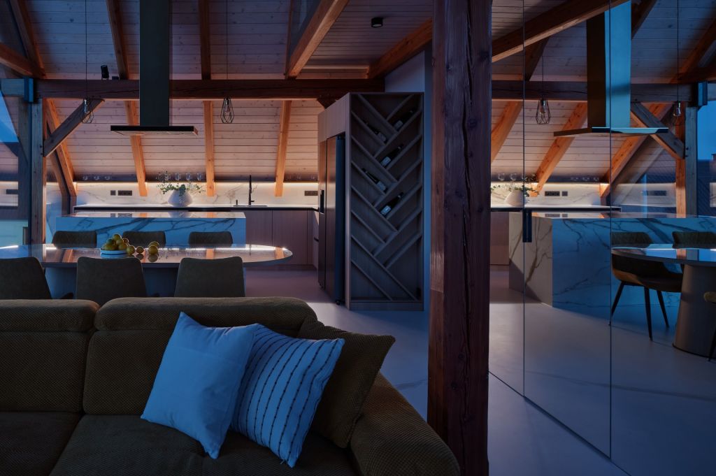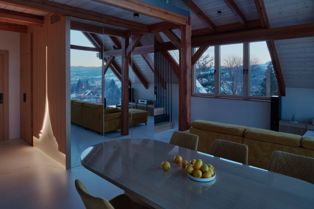 • Interiér mezonetového bytu v moderní roubence reaguje na okolní krajinu a symbolicky odkazuje k hoře Ještěd.