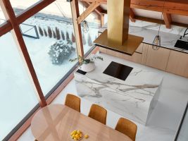 Designérka pracovala s kombinací přírodního dubu a mramoru Calacatta, které dodávají interiéru nadčasovost a eleganci. Kuchyňský ostrůvek slouží jako přirozené centrum dění, ať už je to místo pro vaření i neformální setkávání. Každý kus nábytku byl navržen na míru s důrazem na funkčnost a detail.