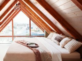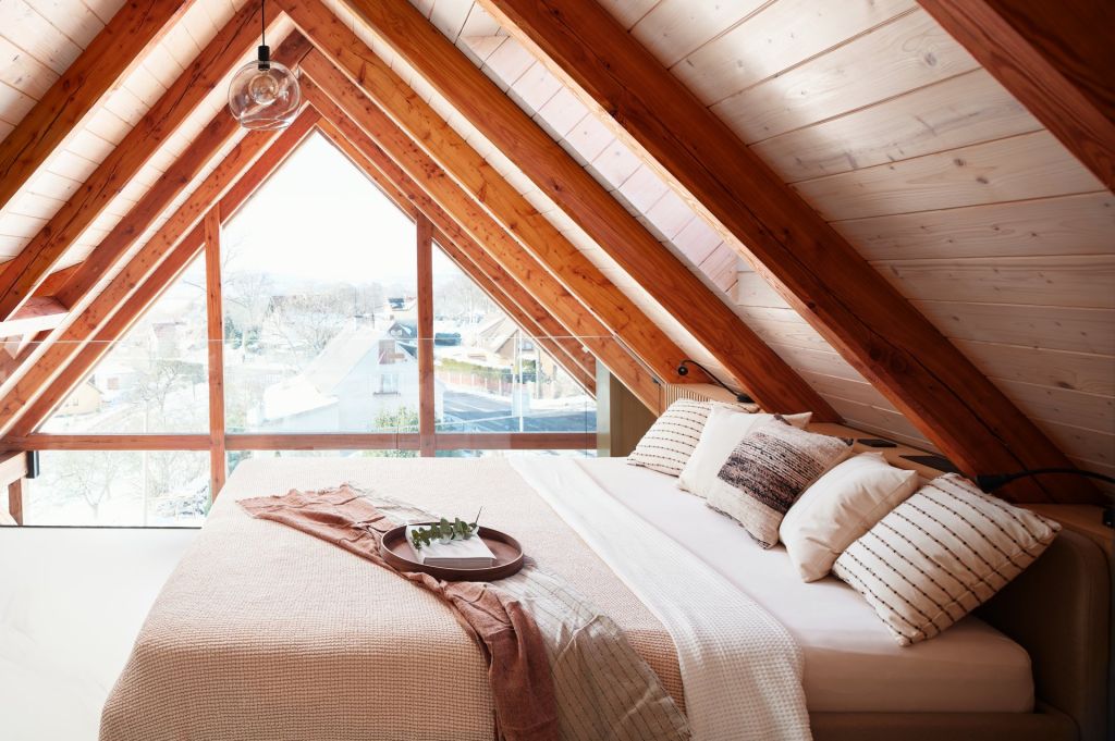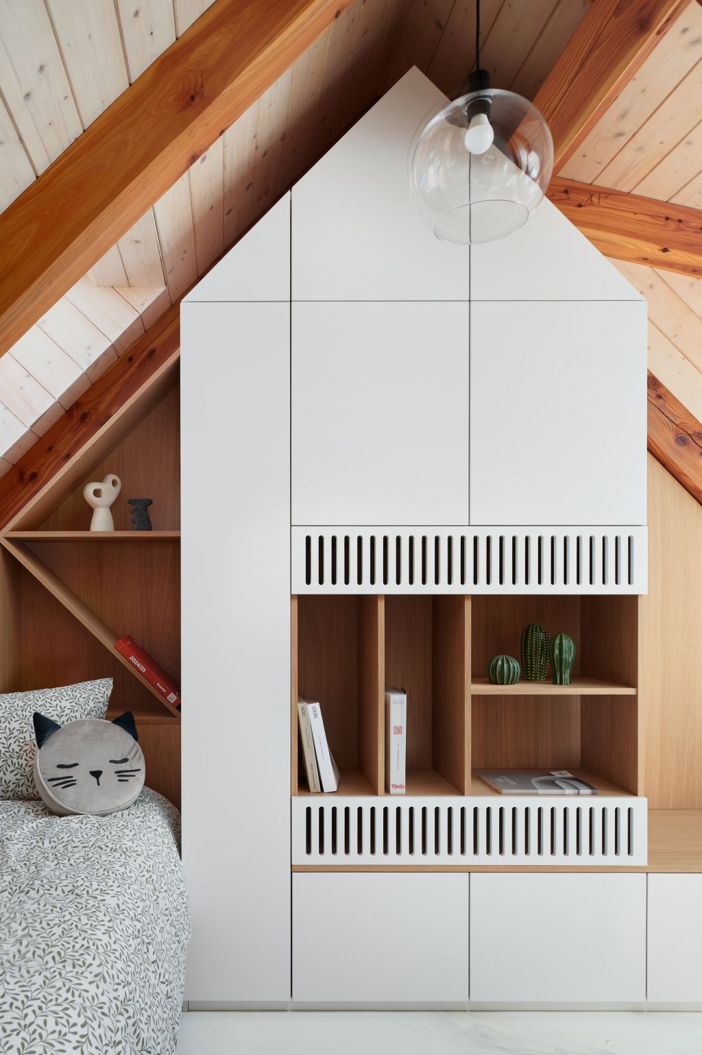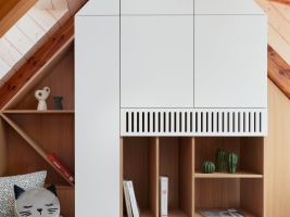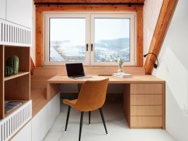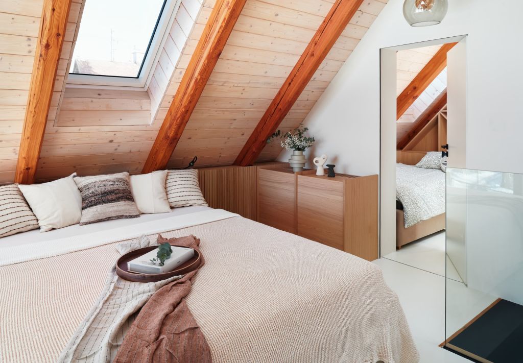 Pod schodištěm vznikl útulný pracovní kout s knihovnou, který využívá každý centimetr prostoru. Ložnice v podkroví je řešena jako otevřený, vzdušný prostor s odkrytým krovem. V dětském pokoji se střetává hravost a praktičnost, nábytek lze snadno přizpůsobit měnícím se potřebám dítěte.