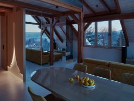 Projekt vznikl v roce 2024 jako návrh interiéru mezonetového bytu v moderní roubence. Cílem bylo vytvořit domov, který bude praktický, útulný a zároveň bude přirozeně reagovat na okolní prostředí. Hora Ještěd se stala ústředním motivem návrhu a její silueta se promítá napříč celým interiérem a to od podsvíceného prvku v centrální šatní kostce až po jemné symbolické detaily v nábytku a dekoracích.