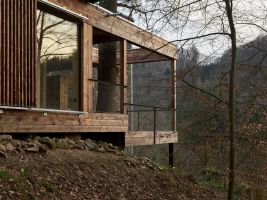 • Konstrukce kombinuje ocelový rám a dřevostavbu s opalovaným modřínovým obkladem.