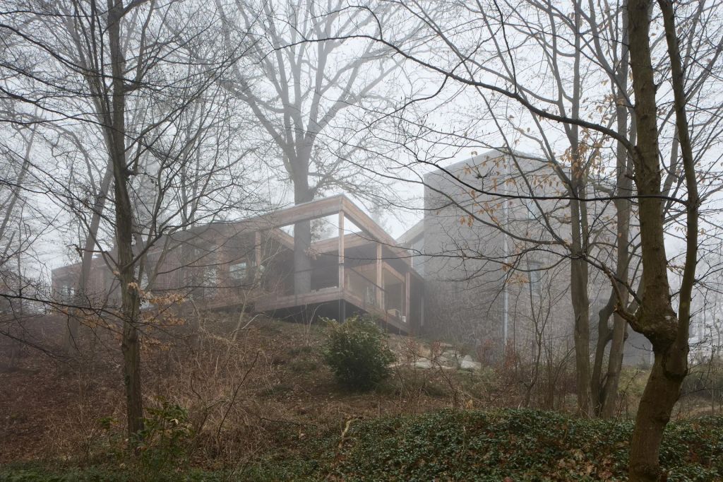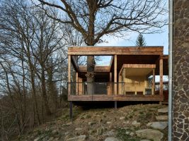 Přístavba je umístěna na pomezí lesa a zahrady, kde tvoří přirozený přechod mezi zastavěným a přírodním prostředím. Krytá terasa propojuje nový objekt s původním domem a integruje vzrostlý dub, který stojí v těsné blízkosti. Do zahrady je přístavba otevřena velkoformátovými posuvnými okny a krytým ochozem, odkud se otevírá výhled do údolí.