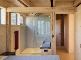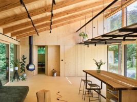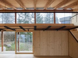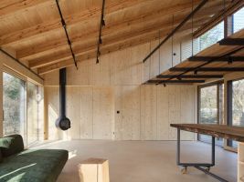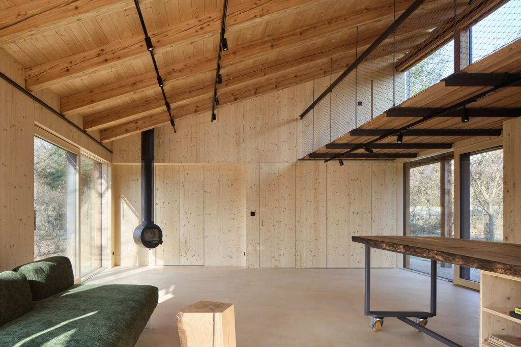 V interiéru dominuje ateliérový prostor s visutou galerií, která doplňuje otevřenou dispozici a umožňuje různorodé využití. Materiálové řešení vychází z přirozenosti dřeva – vnější obklad tvoří opalovaný modřín, interiér je zpracován ve smrkové biodesce s integrovaným nábytkem a úložnými prostory.