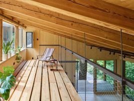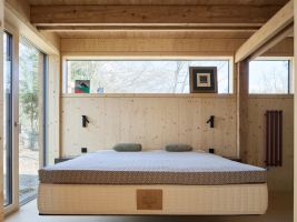 • Interiér tvoří smrkové biodesky, visutá galerie a integrovaný nábytek pro maximální využití prostoru.