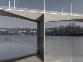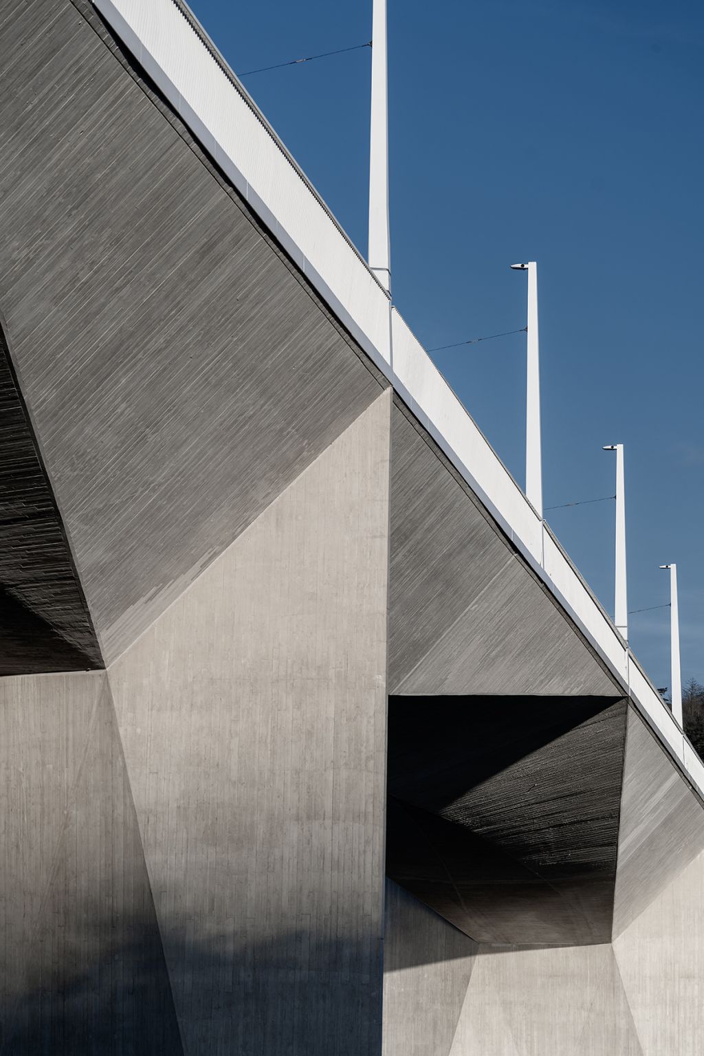 Povrch mostu nese otisk dřevěného bednění, což vytváří charakteristickou texturu a posiluje jeho architektonický výraz.