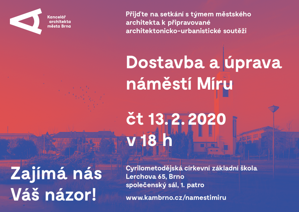 Kancelář architekta města Brna na tento čtvrtek chystá setkání s veřejností. Tématem bude proměna náměstí Míru, které dlouhodobě nefunguje jako náměstí a potřebuje celkové a koncepční řešení. V prosinci loňského roku proto brněnští radní pověřili KAM organizací otevřené urbanisticko-architektonické soutěže. Vypsaná má být na jaře letošního roku. „Problematické je zejména stávající dopravní řešení a celková neuspořádanost prostoru. Kultivaci vyžaduje vše od prostoru před kostelem svatého Augustina, vstupů do parku Kraví hora po zastávky tramvaje,“ doplnil vedoucí oddělení veřejného prostoru KAM David Zajíček.