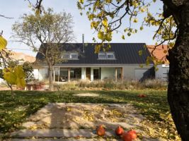 Provozně je stavba dělena na dva základní celky – průjezdnou garáž s půdou a na část určenou k bydlení. „Nejvíce nás zaujala krásná zahrada. Rozhodli jsme se staré stavení zbourat a na místě vystavět nový dům. Limitovala nás frekventovaná silnice, která vede před domem, proto jsme dům lehce odklonili právě do krásné zahrady, kam se obytný prostor otevírá a nabízí dokonalé propojení s přírodou. Zachovali jsme průjezdnou garáž a půdorys prvního patra v moderním přepisu,“ říká architekt Radek Pasterný.