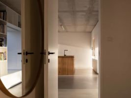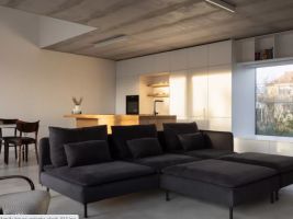 Interiér je pojat kontrastně k černé. Celému prostoru dominují cementové stěrkové podlahy, pohledové betony na stropě a bílá výmalba na stěnách. Nábytek je vestavěný v bílé barvě doplněný o výrazné dubové masivní prvky. „Interiéry jsme chtěli navrhnout jednoduše a stroze a dát vyniknout dřevěným prvkům. Například kuchyňský pult odkazuje na řeznický stůl, protože dědeček byl řezník. Jedná se o kus masivu vložený do středu centrálního prostoru,“ říká architekt Radek Pasterný.