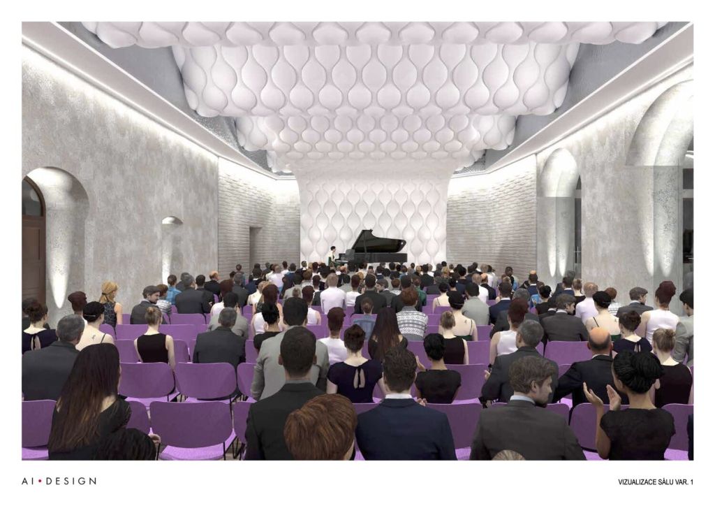 Jádrem reprezentativních prostor pak bude společenský sál ve třetím podlaží. Ten byl v době svého vzniku druhým největším reprezentativním sálem v Čechách po Vladislavském sále na Pražském hradě a do loňského roku v něm sídlila expozice skla. V rámci nového projektu podle architektů Evy Jiřičné a Petra Vágnera z AI DESIGN se k sálu dostaví reprezentativní foyer o podlaží níže a také zázemí pro catering, šatny a hygienické zázemí. Propojí se tak druhé a třetí podlaží, aby oba velké sály severního křídla tvořily organický celek. Velmi zajímavým prvkem pak bude speciální zprohýbaný podhled, který nahradí stávající betonový strop. Tento prvek bude působit designově, a především pomůže v lepší akustice sálu.