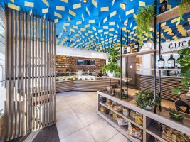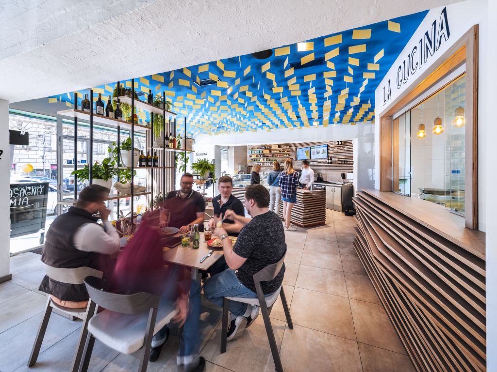 „Přibližně 3 000 kusů sušených těstovinových plátů shlíží z modře vymalovaného stropu, který barevně odpovídá odstínu původní fasády, a vytváří nápaditý přechod mezi interiérem a venkovním světem. Při večerním osvětlení je navíc možné pozorovat zajímavou stínohru,“ říká Sean Clifton, ředitel pražského studia Jestico + Whiles.