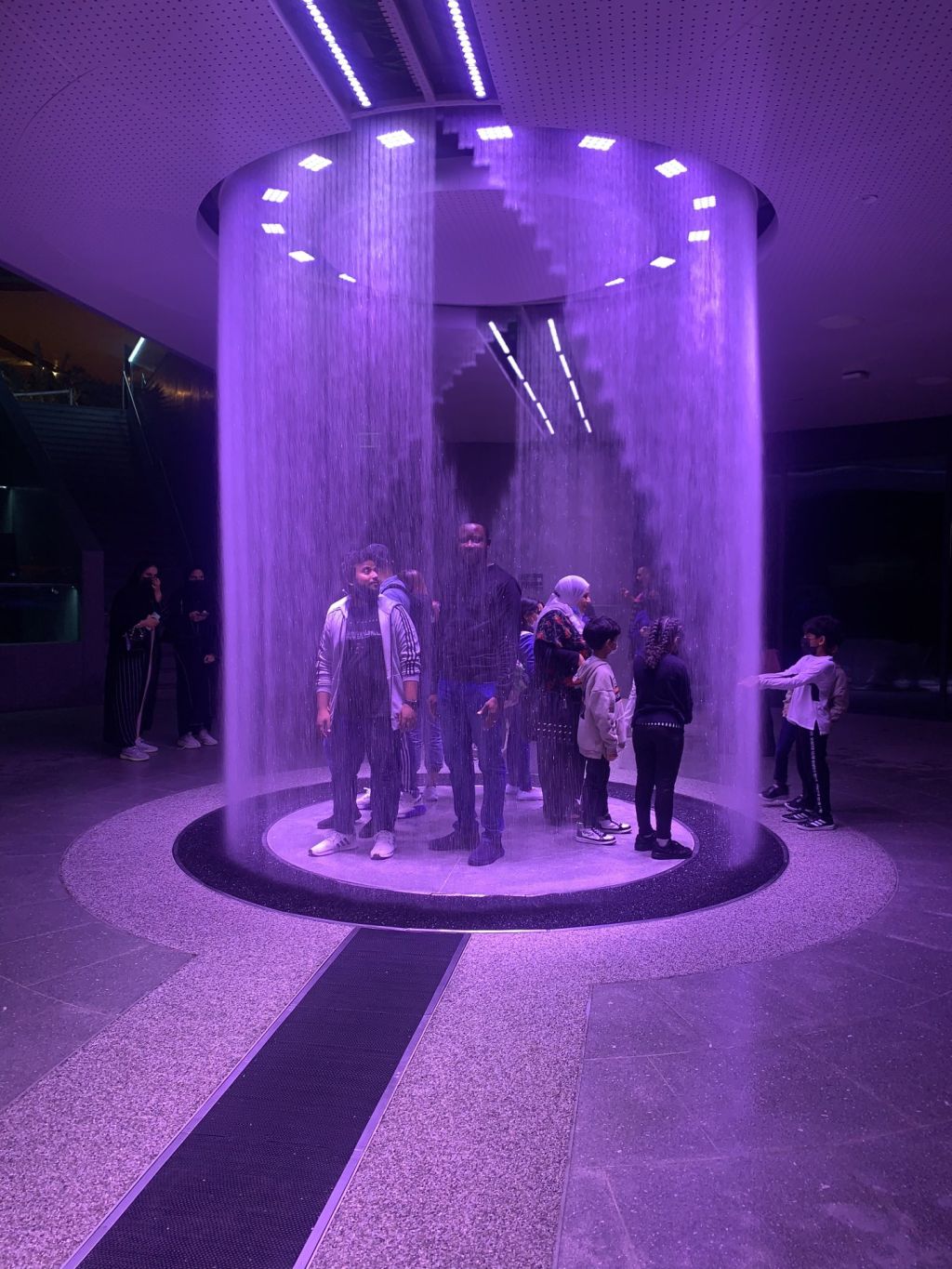 Srdcem pavilonu je pak kašna, do které stéká voda z organických kapilár vyrobených ze stejného materiálu jako spletený mrak stínící zahradu okolo národního pavilonu.