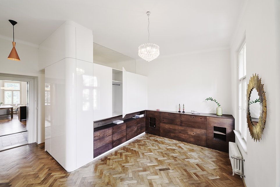 Cílem architektů bylo najít co nejlepší dispoziční řešení, vyměnit infrastrukturu, pietně ošetřit a pouze vhodně doplnit to hezké co v bytě zůstalo.