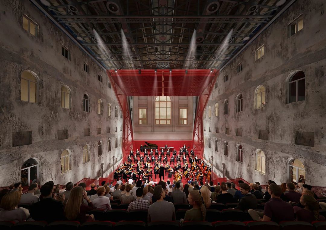 Výjimečný je v mnoha směrech i vestavěný koncertní sál. Protože památkáři nechtěli, aby jakkoliv zasahoval do historické budovy, byla konstrukce o váze několika set tun spuštěna do atria po jednotlivých dílech jeřábem skrz strop a teprve v atriu byla sestavena. Sál pro 300 diváků stojí na šesti nohách, a celá konstrukce ovládaná hydraulikou je tak jakoby nad podlahou atria. Systém otočných zvukových stěn nad pódiem umožňuje sálu vytvářet akustiku pro různé typy koncertů a představení včetně těch nejnáročnějších.