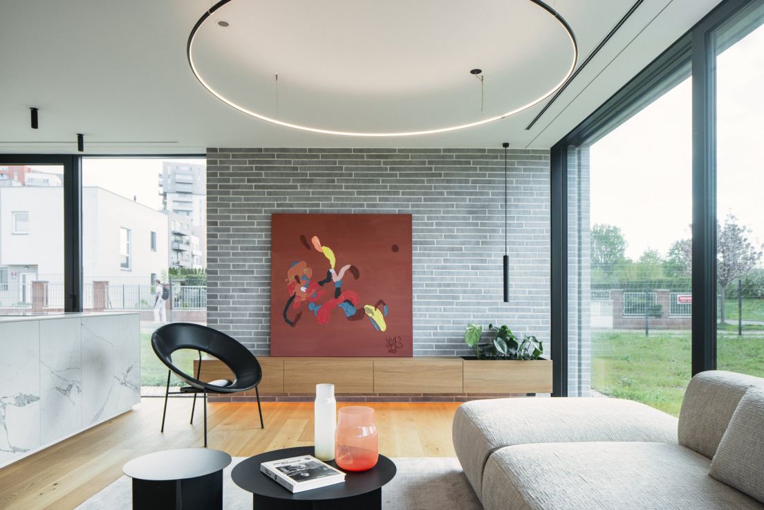 Dům o zastavěné ploše 121 metrů čtverečních stojí v klidné zástavbě Letňan. Jednoduchý tvar doplňuje kombinace bílošedých cihlových pásků, černých rámů a velkých prosklených ploch, které propojují interiér se zahradou i terasou v horním podlaží. Fasádní materiály se objevují také uvnitř domu, například na televizní stěně, což dodává prostoru jednotu.
