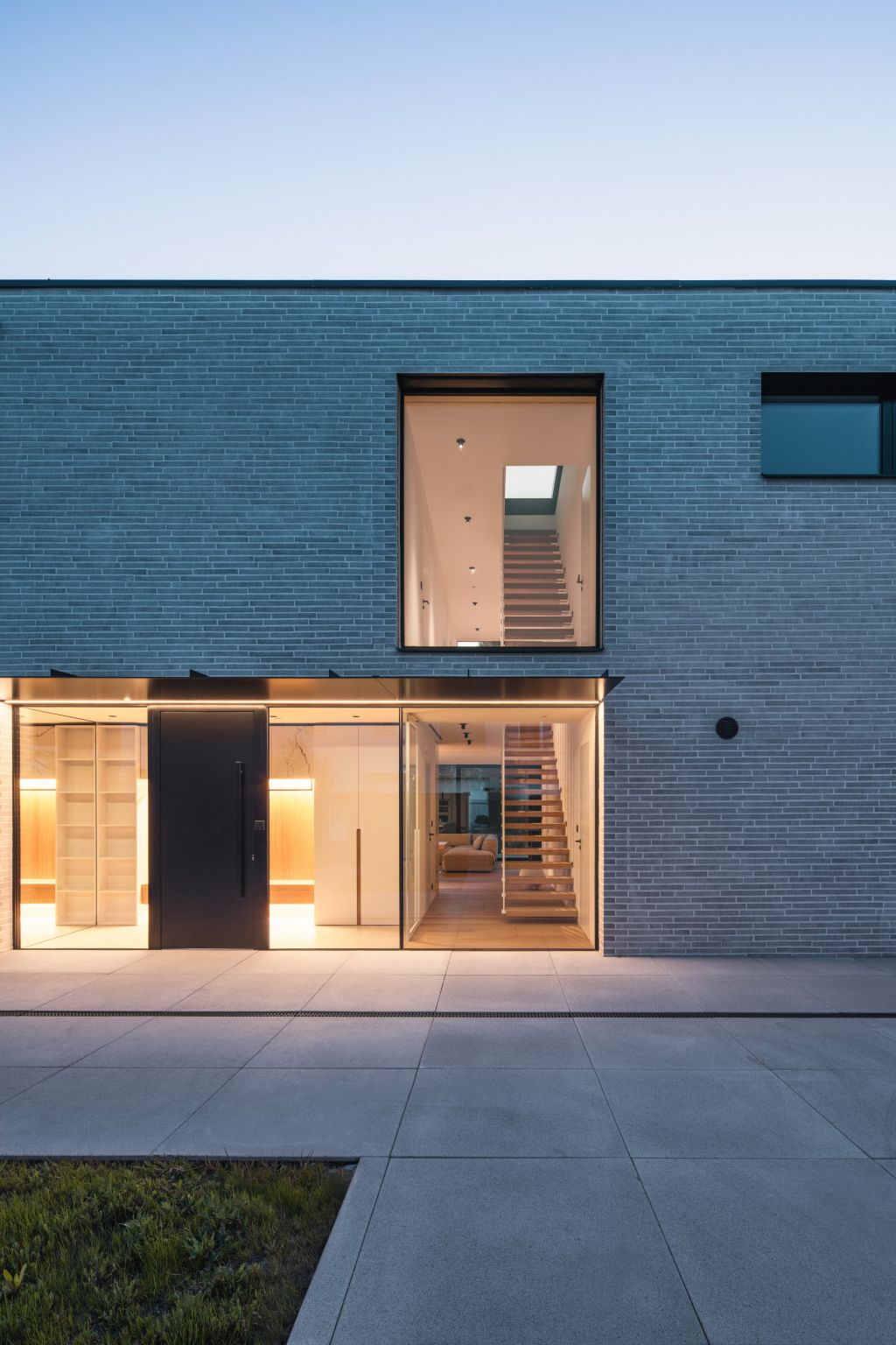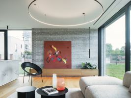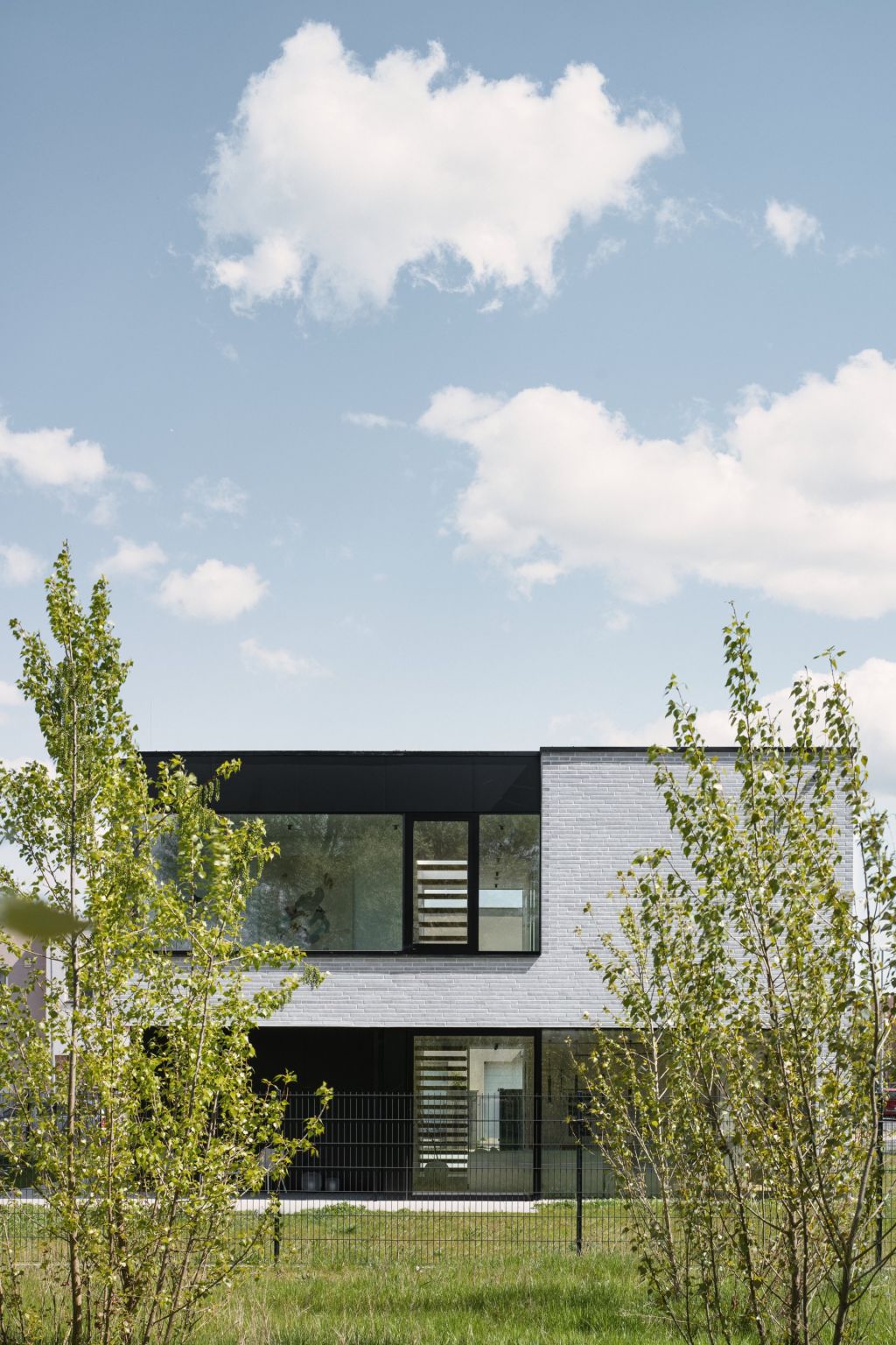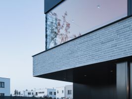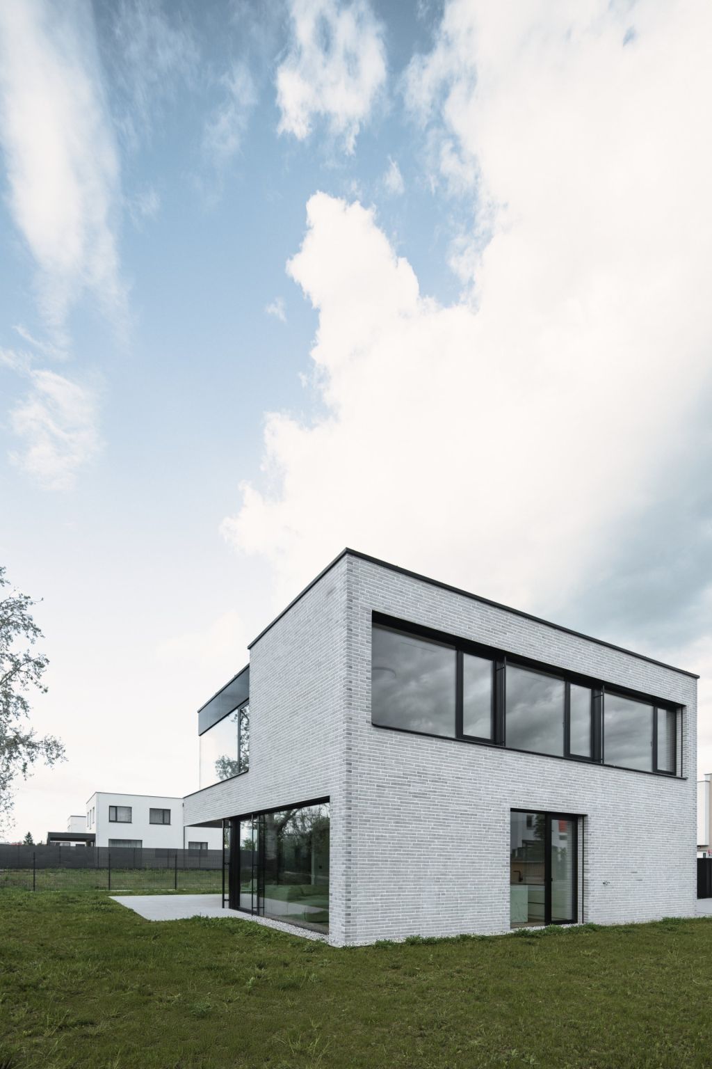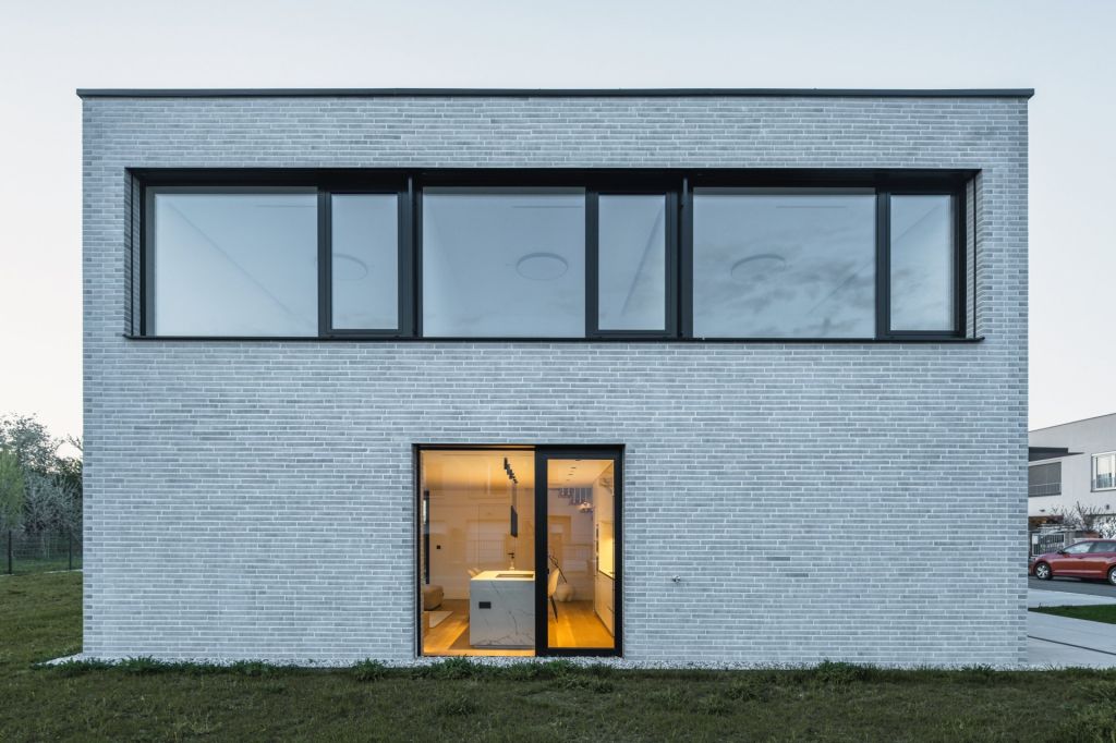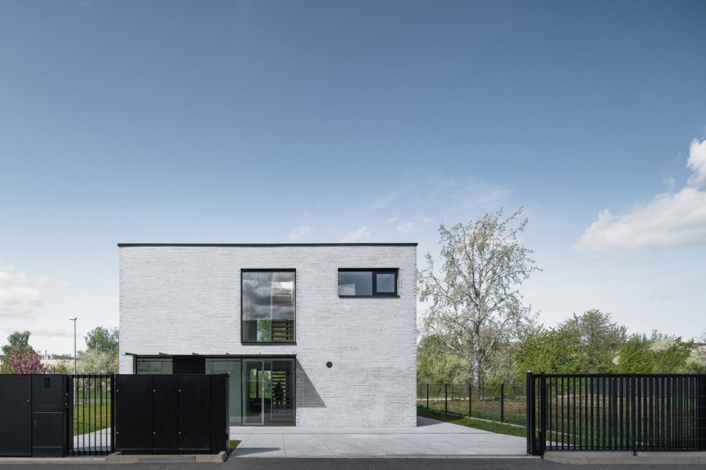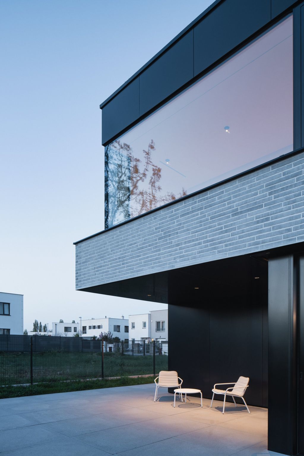 Dům o zastavěné ploše 121 metrů čtverečních stojí v klidné zástavbě Letňan. Jednoduchý tvar doplňuje kombinace bílošedých cihlových pásků, černých rámů a velkých prosklených ploch, které propojují interiér se zahradou i terasou v horním podlaží. Fasádní materiály se objevují také uvnitř domu, například na televizní stěně, což dodává prostoru jednotu.