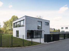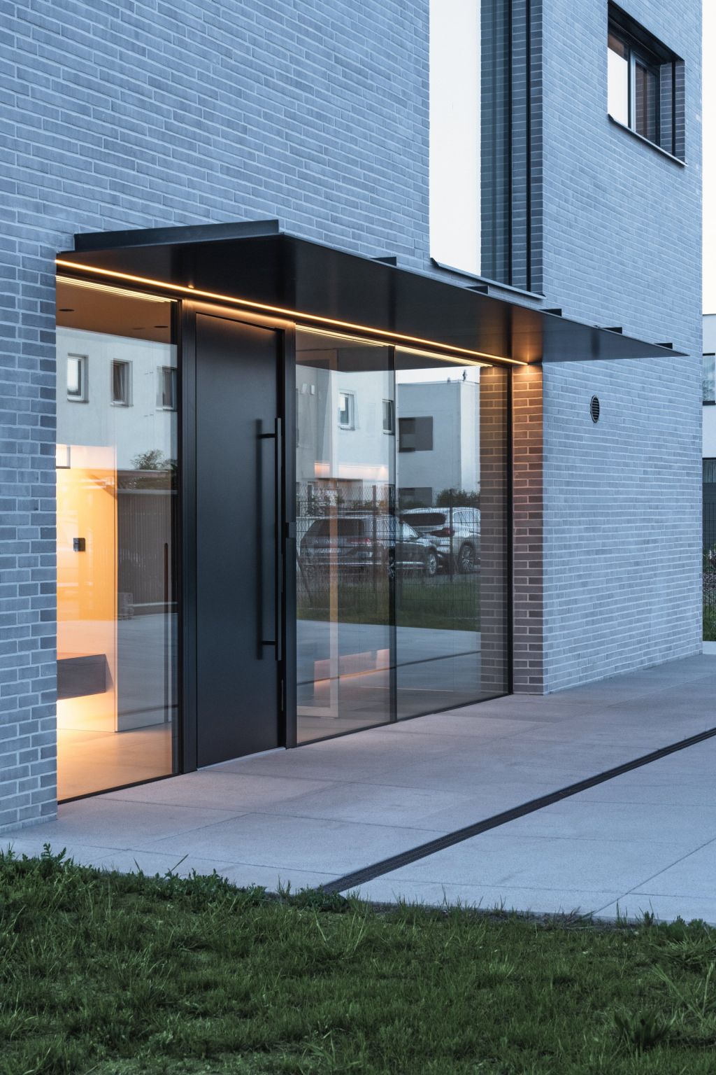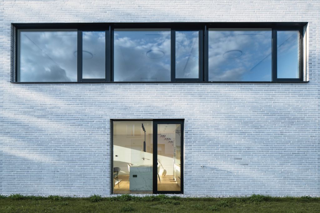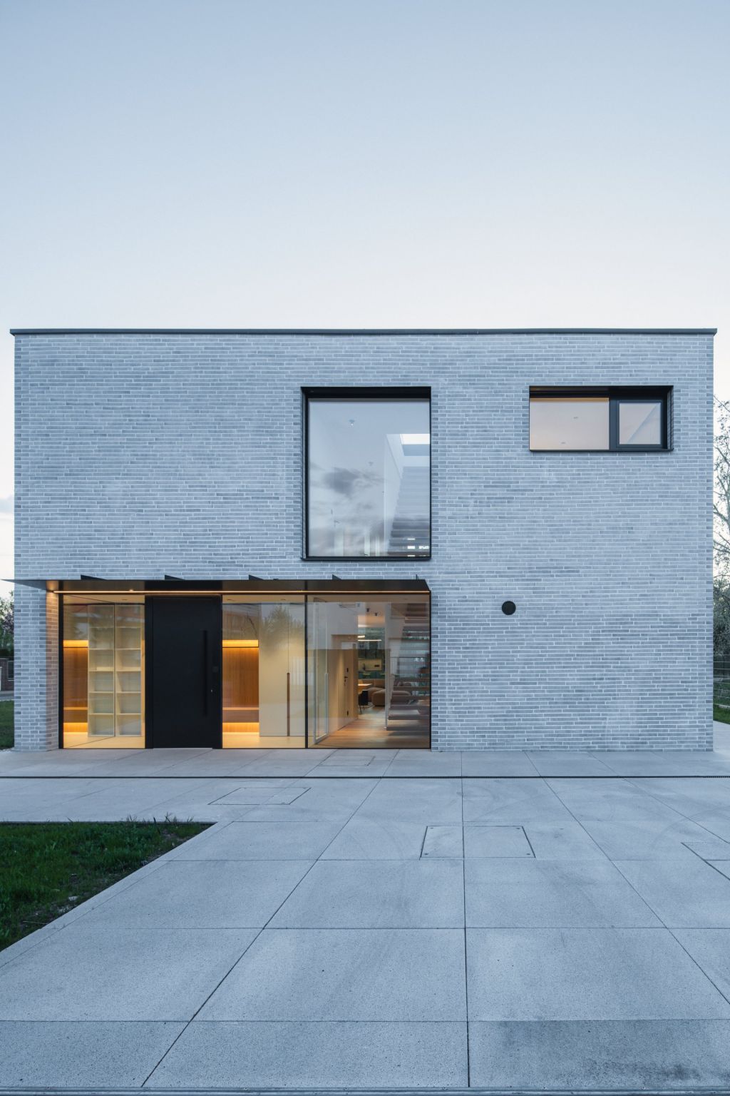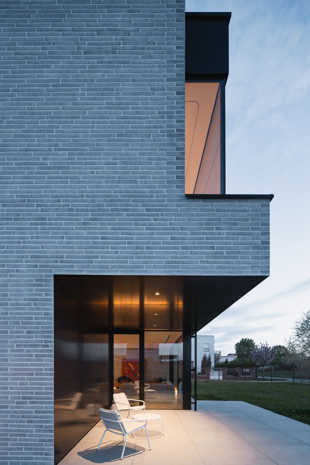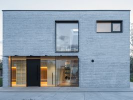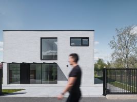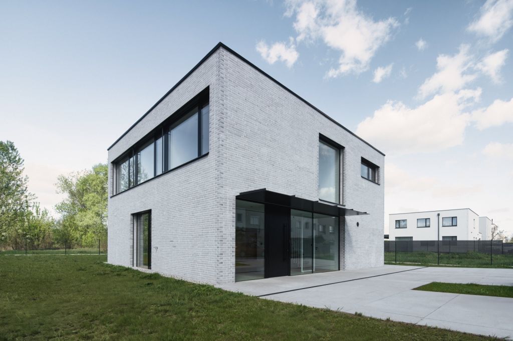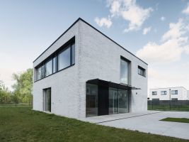 Dům o zastavěné ploše 121 metrů čtverečních stojí v klidné zástavbě Letňan. Jednoduchý tvar doplňuje kombinace bílošedých cihlových pásků, černých rámů a velkých prosklených ploch, které propojují interiér se zahradou i terasou v horním podlaží. Fasádní materiály se objevují také uvnitř domu, například na televizní stěně, což dodává prostoru jednotu.
