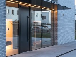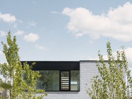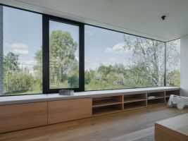 • Kompaktní dům v Letňanech propojuje interiér se zahradou pomocí velkých prosklených ploch a pracuje s kvalitními materiály v jednotném vizuálním stylu.