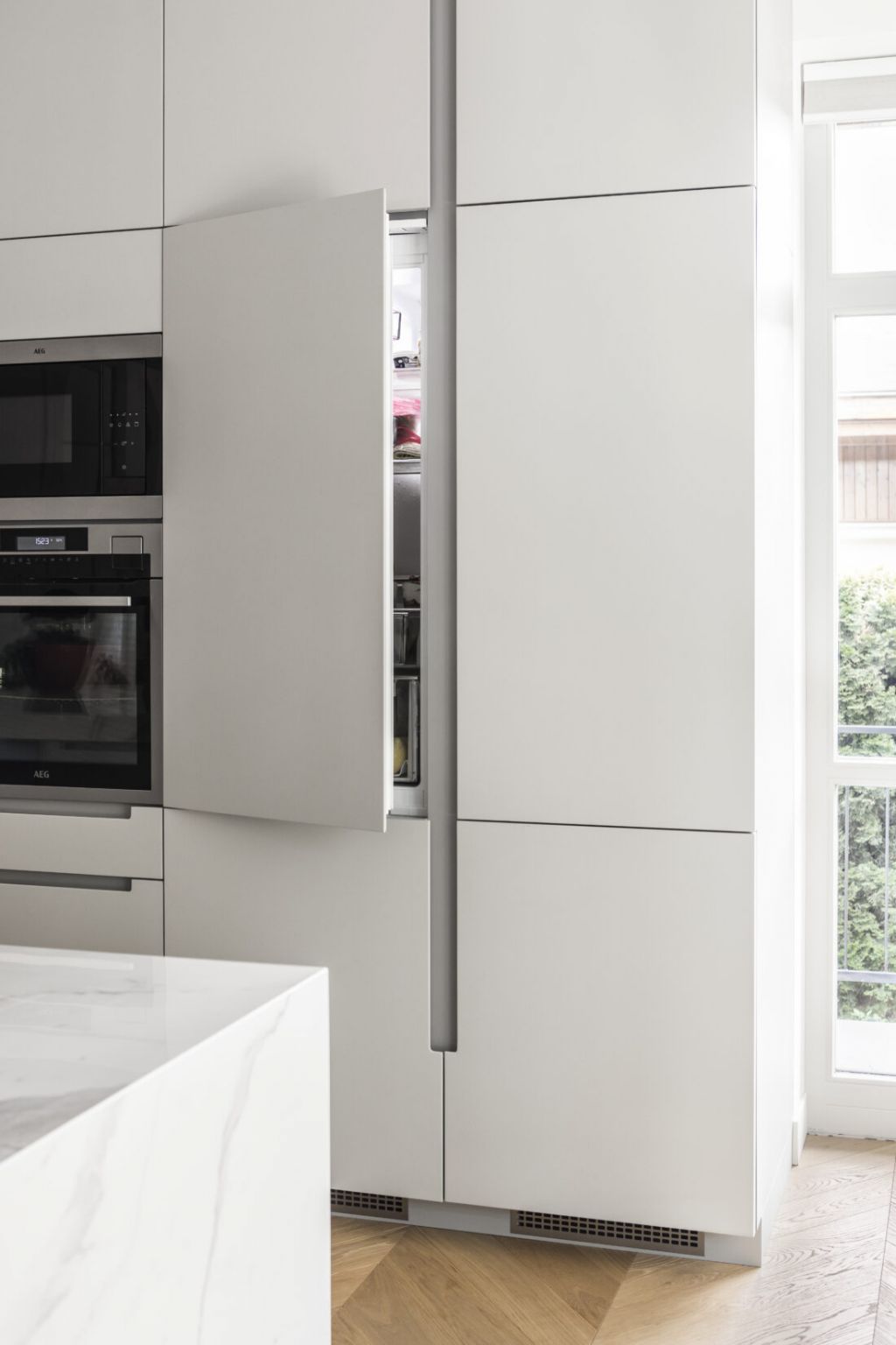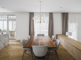 Prostor doplňuje nábytek z dubové dýhy. Nenápadné povrchy skvěle dozdobily luxusní doplňky, jako mosazné úchytky, svítidla a jídelní židle.