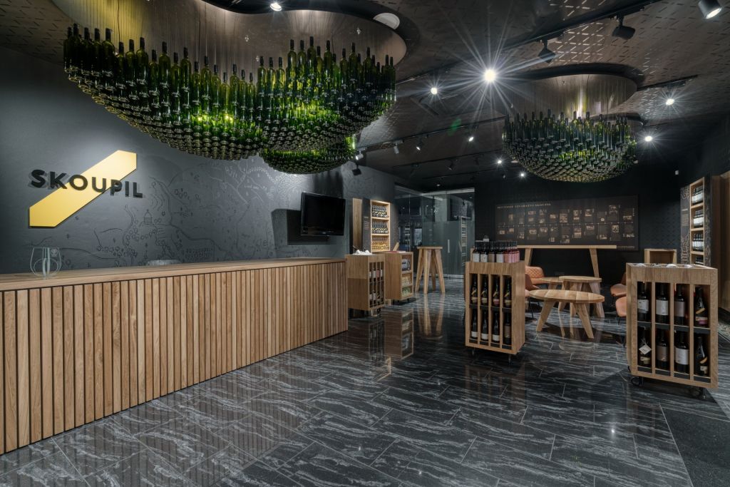 Dominantou prodejny jsou famózní lustry složené z 1 220 olivově zabarvených vinných láhví zavěšených na ocelových lankách o celkové délce půl druhého kilometru. Svým tvarem znázorňují pálavské vrchy a osvětlují tmavě laděný elegantní interiér. Na zdech jsou průhledným lakem nanesené vzory z vinných etiket. Prostor doplňují dubové police, stoly a skříně. Čela dubových skříní jsou napřímo potištěná vzory z etiket a texty popisujícími jednotlivé kolekce Skoupilových vín. „Vinařství Skoupil v sobě spojuje mladistvou energii synů s umem a klidem otců. Snažili jsme se, aby interiér tyto hodnoty vyjadřoval. Víno, jako výsledek práce, je alfou i omegou konceptu,“ představil svůj záměr architekt Václav Kocián ze studia Hua Hua.