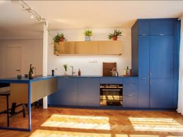 Ačkoliv má byt 88 m2 a působil tísnivě, architektům se podařilo dispozici otevřít a zvýšit její funkčnost, zvětšit obytný prostor a dát bytu nové a svěží barvy. „Jedná se o kompletní rekonstrukci starého bytu, který byl zařízený v duchu 90. let. Zrušili jsme zbytečné metry chodeb a byt otevřeli do jednoho celku, členitý obytný prostor jsme propojili do jednoho celku. Líbil se nám přístup investorů, kteří při plánování nebyli konzervativní. Přáním majitelky bylo využít v interiéru námořnickou modř, což jsme zkombinovali se zlatými plechy, a vznikl tak velmi barevně dominantní prostor. Obývací prostor jsme následně doplnili o růžovou modulární pohovku dělanou na míru,“ říká architekt Pavel Lejdar.