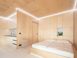 „My jsme tu základní verzi připravili tak, aby byla pro zákazníka v podstatě okamžitě obyvatelná, chápeme, každý si nemůže dovolit tou plnou verzi. Součástí té základní verze je plně vybavená koupelna, osvětlení, veškeré obklady a fasáda. Jediné, co tam chybí je kuchyňská linka, postel nebo klimatizace, ale myslíme si, že to jsou věci, které si každý zákazník představuje jinak,“ vysvětluje designérka.