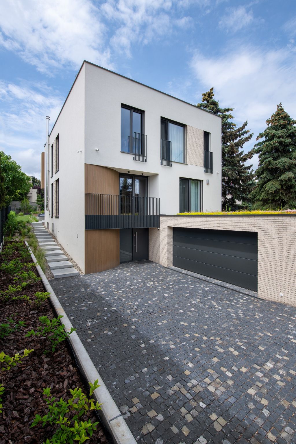 Rodinný dům představuje co nejideálnější spojení soukromí a intimity s otevřenými výhledy. Pozemek je poměrně svažitý, s nejvyšší úrovní v jeho přední části, ze strany tiché soukromé příjezdové cesty. Přáním investorů bylo vytvořit takové dispozice, kdy by všechny nejdůležitější místnosti denní a noční zóny byly na jednom podlaží a zpřístupněny bez jakýchkoliv bariér. Dalším požadavkem byl interiérový bazén. Tento požadavek byl splněn díky velkým posuvným oknům. Zajímavostí bazénového prostoru je i jeho horní osvětlení přirozeným denním světlem.