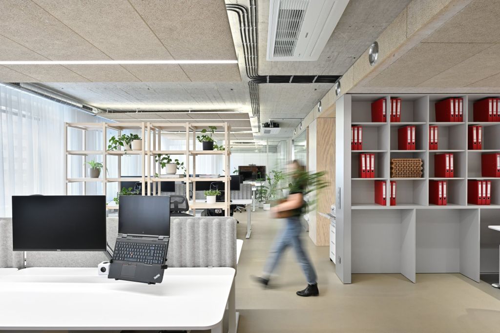 Již delší dobu bylo potřeba zázemí ateliéru přestěhovat do větších prostor. Architekti se nakonec ujali rekonstrukce stávajících prostor. Jednalo se o klasický kancelářský trojtrakt z 90. let se středovou chodbou bez oken, ze které vedly dveře do několika místností orientovaných buď na severní nebo na jižní stranu. Cílem bylo vytvořit otevřený prostor plný denního světla. „Rozhodli jsme se tedy trojtrakt koncepčně zachovat, ale nikoli ve svém původním provedení. Odstranili jsme stávající příčky i instalační podhledy, čímž jsme zvětšili světlou výšku a stropní desku jsme odhalili až na železobeton. Nově vzniklý otevřený prostor jsme následně začali členit pomocí tří druhů konstrukcí,“ říká architekt Zoltán Horváth. Prvním byly pevné cihlové příčky. Druhým typem konstrukce byly skleněné příčky a třetím typem oddělující konstrukce se stal samotný nábytek. Výsledný interiér má spíše industriální charakter, a to i kvůli aplikování technické lité podlahy a přiznání skutečných materiálů stavebních konstrukcí. Nábytek je vyhotoven z bělené překližky, běleného smrkového masivu a z popisovatelných povrchů, které při poradách nahrazují tabule.