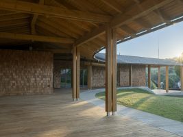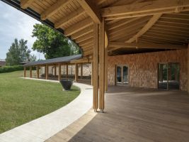 „Přáním bylo navrhnout víceúčelový společenský sál v rámci farního centra s kostelem a farností. Sál komunikuje se stávajícími objekty a zároveň vytváří vnitroblok pro venkovní akce,“ říká architekt Jan Vojtíšek. Symbolika v pojetí architektury jako procesní cesty podtrhuje význam i účel stavby. Variabilní společenský sál je navržen konstrukčně jako cihlová stavba s tradičním šindelovým obkladem z modřínu. Stavba získala řadu významných ocenění a uznání odborných porot.