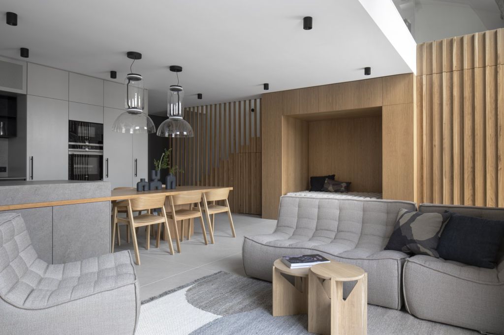 Jednou z výraznějších realizací ateliéru je rekonstrukce loftového bytu v objektu bývalého kina v Pardubicích. Výsledkem je dvoupatrový byt, který nabízí ve spodním patře společenskou část s kuchyní a obývacím pokojem. Zajímavé je napojení na terasu, kde lze plně otevřít velkoformátová okna, a propojit tak interiér s exteriérem. Části stěn v bytě jsou cihlové podle newyorského stylu loftových bytů. V druhém patře se nacházejí soukromé části jako pokoje a ložnice. Velkou zajímavostí je atrium se zahrádkou uprostřed dětského pokoje, které je zdrojem přirozeného světla. Obě patra jsou propojena galerií, na stropech horního patra jsou odkryta betonová žebra, která skvěle kontrastují s hladkými omítkami.