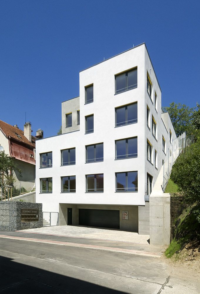 „Dům byl v krásném místě ve složitém terénu s krásným výhledem. Věděli jsme, že budova musí být svým měřítkem a formou vstřícná k okolní zástavbě. Ve finále, byť je to bytový dům, spíše připomíná činžovní vilu. Navrhovali jsme zde i jeden interiér s výhledem do údolí,“ říká architekt Štěpán Malý.