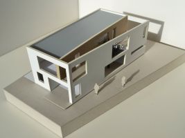 Malá rodinná vila má tři podlaží. Hlavní obytné podlaží je na terénu s přímým výstupem do zahrady. Celé horní patro je koncipováno jako ateliér s vlastním zázemím a vstupem. Použité materiály jsou horizontálně drásaná omítka, plech a pohledový beton.