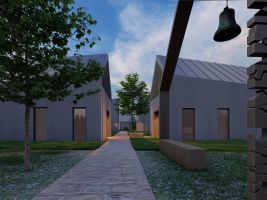 Projekt ubytovacího zařízení ve Volarech. „Jedná se o malé apartmánové domky s prosklenými fasádami a štíty připomínajícími tradiční šumavské stavby. Chceme zde také vytvořit malou náves, zvonici a zachovat místní studnu,“ říká Michal Procházka.