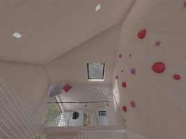 Projekt chaty u Trutnova z opalovaného dřeva je inspirován okolní skalnatou krajinou. „Horolezecké chyty, které jsme zde navrhli, by umožnily lezení jak z vnější, tak z vnitřní strany objektu. Pravidla CHKO nám ovšem nedovolí stavbu zrealizovat,“ říká Michal Procházka.