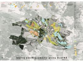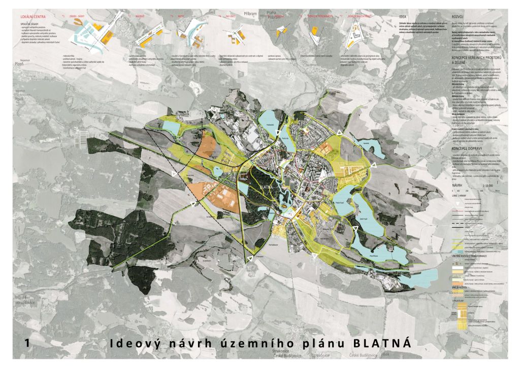 Město Blatná představuje jedinečné spojení města a krajiny, která proniká až do historického jádra. Základní ideou návrhu proto byla především ochrana a rozvíjení zelené páteře města, ochrana krajinných panoramat či zkvalitnění vnitřních městských prostor. „Byla to jedna z prvních soutěží, které jsme se účastnili. Města hledala architekty, kteří by dělali územní plány. Účastnili jsme se více soutěží, zde jsme ale uspěli. Blatná je město protnuté přírodou, je zde říčka Lomnice, sportovní hřiště i zámecký areál. Naším cílem bylo reagovat nejen na samotný veřejný prostor v Blatné, ale i na okolní vesničky. Zde začala naše dlouhodobá spolupráce s tímto městem,“ říká architekt Michal Petr.